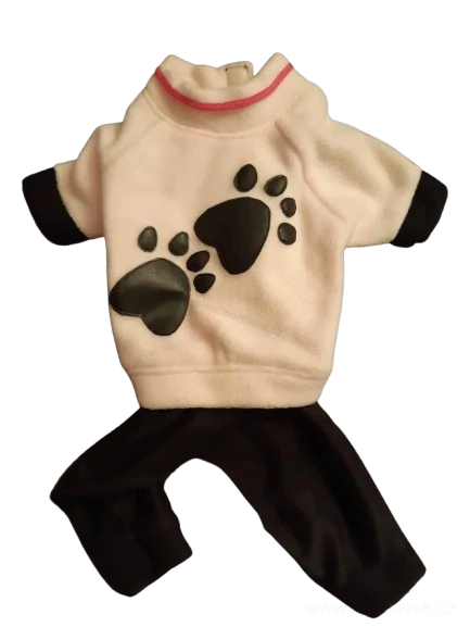 Tepláková souprava s tlapkami na zádech. Tepláčky jsou černé barvy, vršek je světle růžový. Materiál teplákovina a fleece.