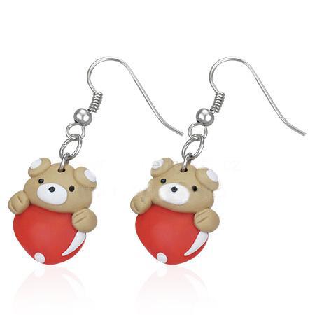 Módní náušnice medvídek, visací na řetízku, se srdíčkem.