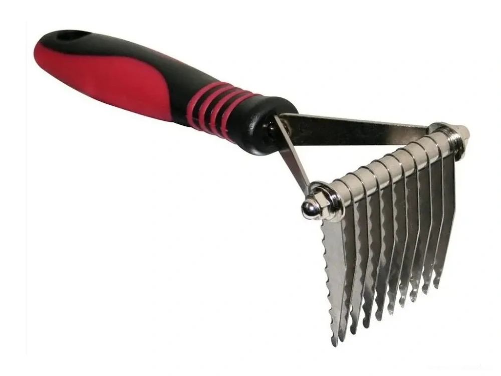 Prořezávací hrábě s pevnou, dlouhou zvlněnou čepelí. Kotouče jsou upevněny na pevné základně , aby se zabránilo rizikům poškození srsti a kůže.