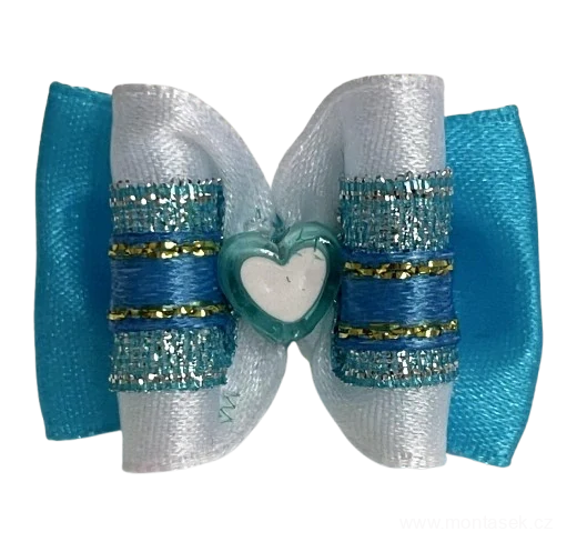 Modrá ručně vyrobená mašlička, zdobená srdíčkem, precizní výroba, z kvalitní pevné stuhy, na silikonové gumičce. Mašličky jsou vhodné pro všechny dlouhosrsté psy a mají dlouhou životnost.