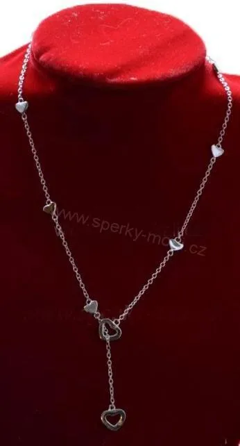 Elegantní postříbřený náhrdelník se srdíčky. Klasické zapínání řetízku. Spodní část nastavitelná na délku 23-25cm celkové délky náhrdelníku.