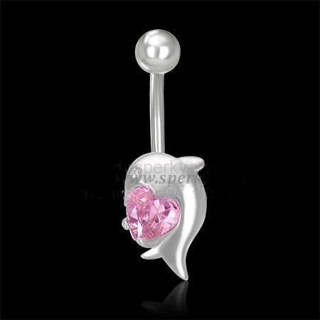 Chirurgická ocel piercing do pupíku, elegantní šperk ve tvaru delfína, s růžovým kamínkem