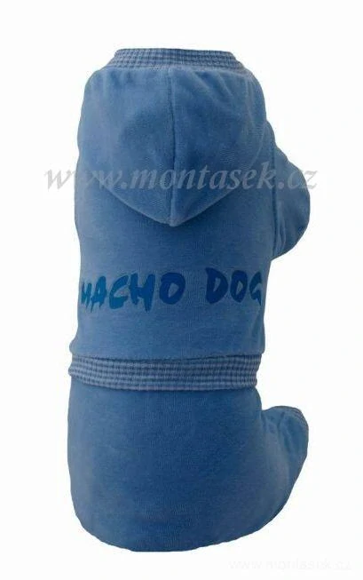 Rozepínací teplákovka pro psa, mikina pro psa. Velurová tepláková souprava s kapucí, na zádech s nápisem. Souprava je zakončena pružnou lemovkou, v pase rozdělená, zapínání na druky, lze nosit samostatně jako mikinu. Lze prát v pračce ve 40°C.