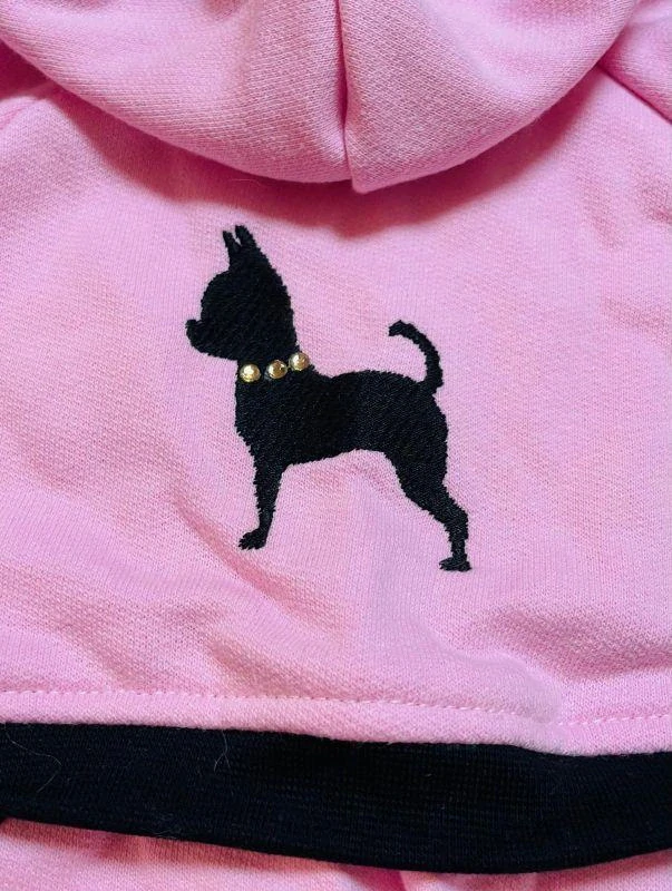Růžová dvoudílná tepláková souprava s výšivkou čivavy.
