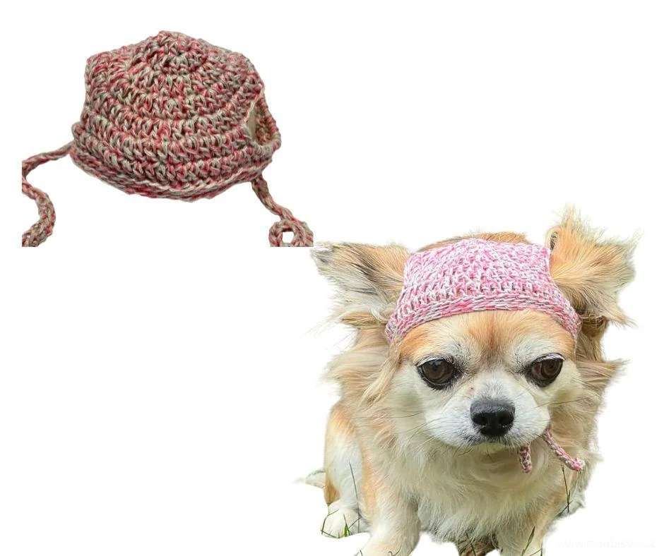Ručně háčkovaná čepice pro psa, zavazování pod bradou.