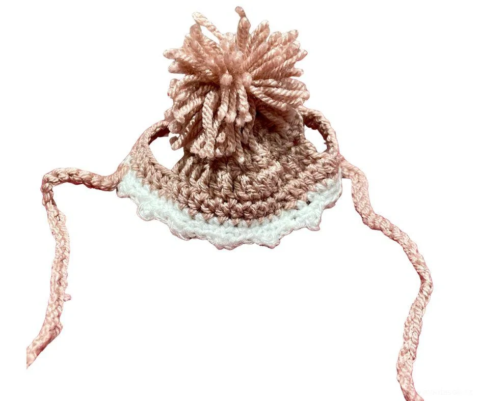 Ručně háčkovaná čepice pro psa, po stranách otvory na uši, zavazování pod bradou.