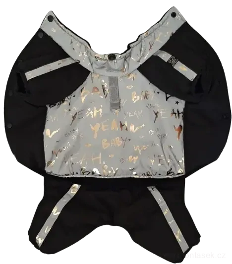 Zimní kombineza bez kapuce. Z kvalitní nepromokavé látky, podšitá fleesem a zateplená vatelínem. Reflexní část bundy při večerním venčení krásně svítí a je pejska dobře vidět. Zapínání na břiše.