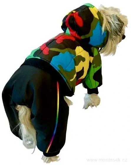 Zimní kombineza pro psa. Barevný maskáčový overal pro psy. Kombineza pejska ochrání proti větru, zimě i dešti.